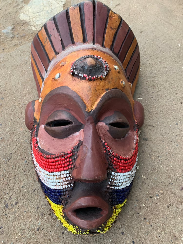 SALE 30% off Use code: TAKE30 *Flat rate delivery for multiple purchases.* Handpicked by yours truly & sourced from the beautiful island of Zanzibar, this wood carved mask is a an art representation of the Makonde peoples of Tanzania 🇹🇿 Decorated with seed beads, cowrie shells, & sea shells, the mask measures roughly 17" from top to bottom and 7" across. All purchases made under the "Ghana Unique Finds" directly supports local artisans and craftsmen. Please note that orders are being shipped from Ghana, so please allow up to 3-4 weeks for delivery.