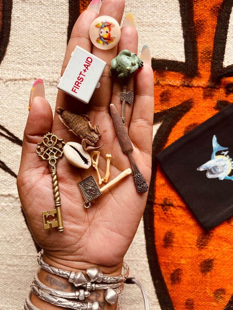 This uniquely curated bone set is perfect to use in divination, spell work, and/or ritual. Please note what is included in the bone set via this description so that you may reference in the future. A list will not be included in the set. If you are looking for guidance on how to use in divination, please refer to my "Bone Throwing Divination" series available on the site. This bone set includes: * 1 dried scorpion * 1 frog curio * 1 rat hip bone * 1 rat leg bone * 1 bible curio * 1 first aid kit curio * 1 skeleton key * 1 cowrie shell (back in) * 1 knife curio * 1 coyote toe bone * 1 axe curio * 1 button * 1 custom pouch to house bone set Because I'm feeling generous, this set comes with a FREE juju Aicha oil. You can use the oil to anoint & purify your hands before throwing your bones. Or you can use the oil to cleanse your bone set before and after each divination session. The choice is yours! And yes, this oil is sourced straight from Ghana. So just know I'm sharing my own personal juju with y'all 💙 As with all spiritual tools, please allow your own spirit to guide you in use.