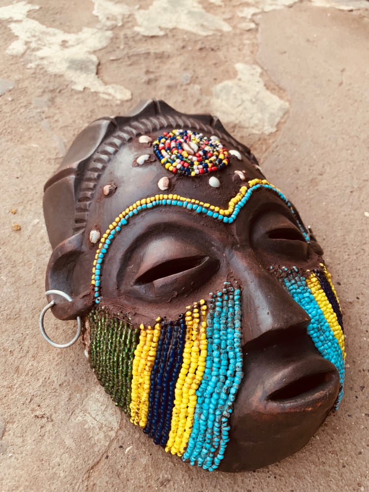 Decorated with seed beads, cowrie shells, & sea shells, the mask measures roughly 17" from top to bottom and 7" across.