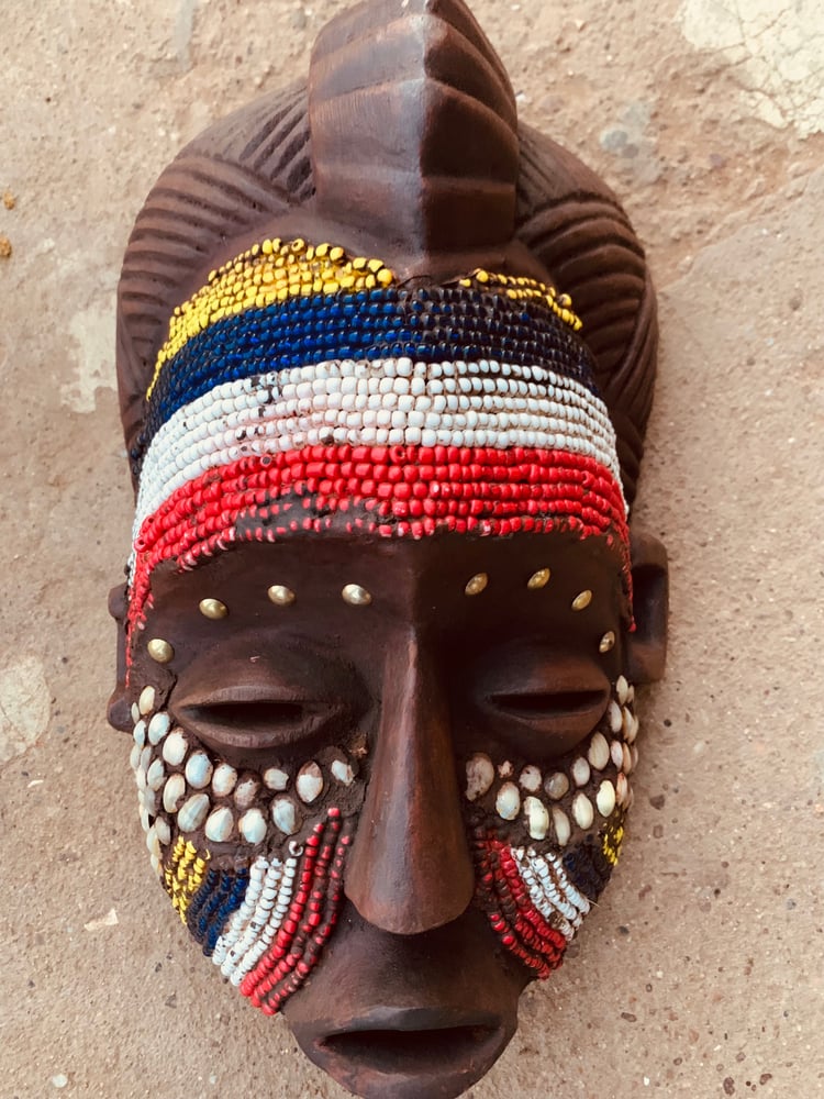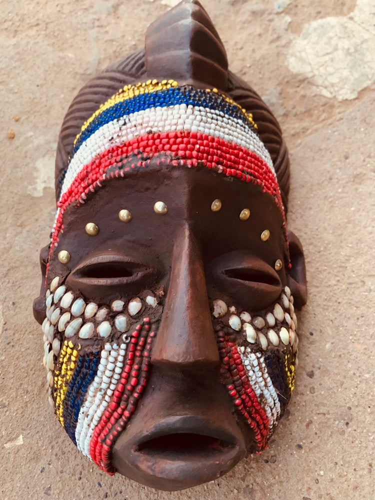 Decorated with seed beads, cowrie shells, & sea shells, the mask measures roughly 17" from top to bottom and 7" across.